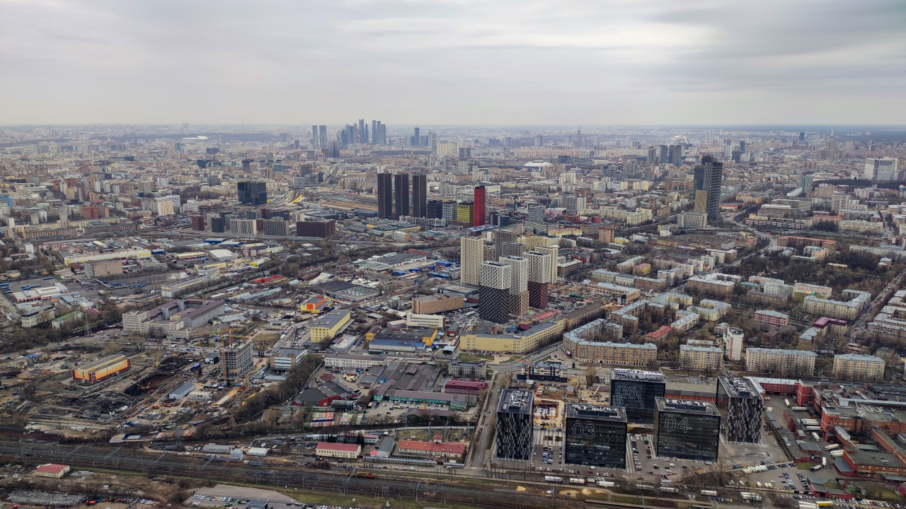 Снимок показывает значительную часть центральных районов Москвы, просматриваемых с высоты обзорной площадки Останкинской телебашни — инженерного символа советской эпохи. В кадре заметны железнодорожные пути, транспортные развязки, плотная многоэтажная застройка и новый жилой кластер. Вдали виден деловой центр с высотными башнями. Фото можно использовать в аналитических и градостроительных материалах о развитии центральной части города и инфраструктуры.