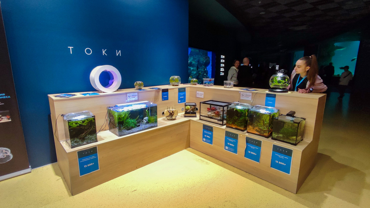 Торговая витрина с настольными аквариумами в зале Москвариума