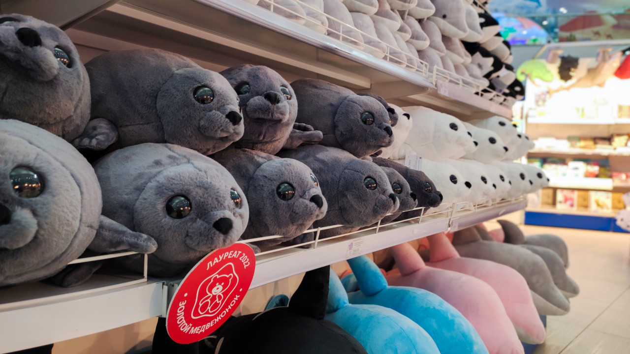 Мягкие игрушки-тюлени на полках сувенирного магазина