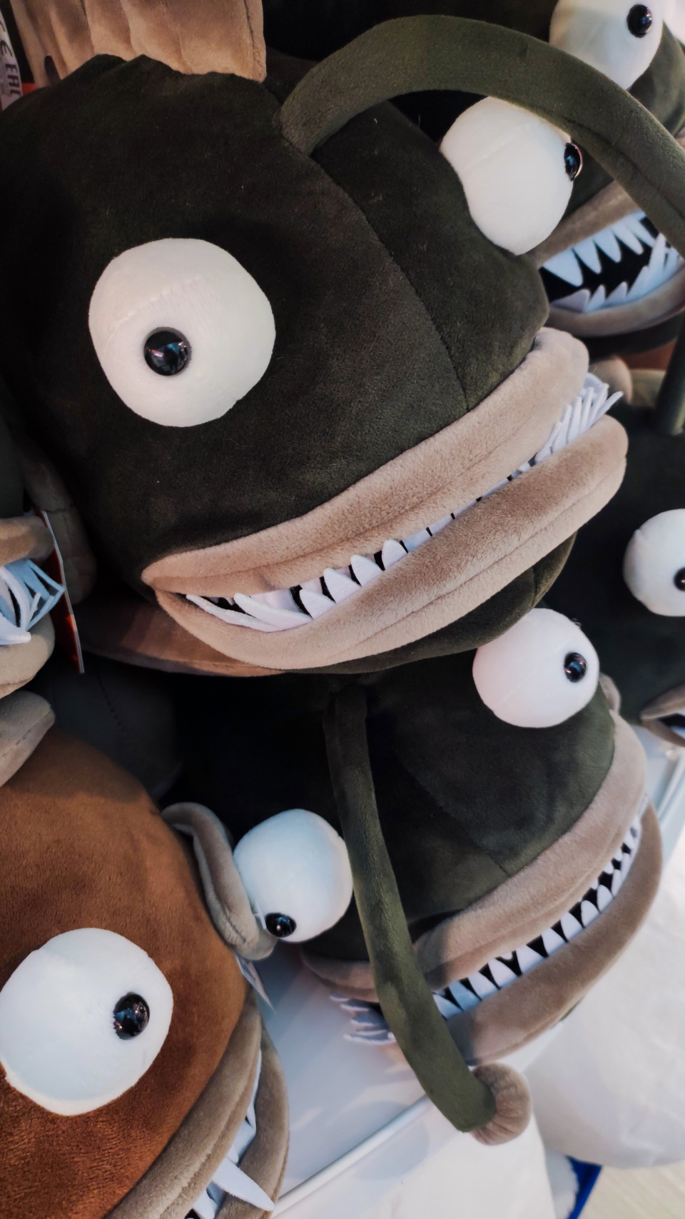 Вертикальный кадр показывает мягкую игрушку в форме рыбы-удильщика в максимальном приближении: заметны большие белые глаза, вытянутый «усик» и зубастый рот. Позади располагаются другие такие же игрушки на торговом стенде. Цветовая гамма темная, преобладает зеленый и бежевый. Снимок сделан в помещении, что видно по равномерному освещению и фрагментам полок. Используется для тем о детских товарах, сувенирах и визуальном ассортименте магазинов.