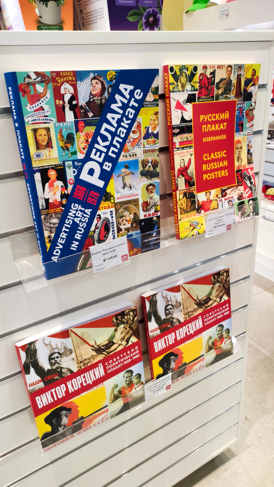 Книги о советском и русском плакате на полке музея или книжного магазина