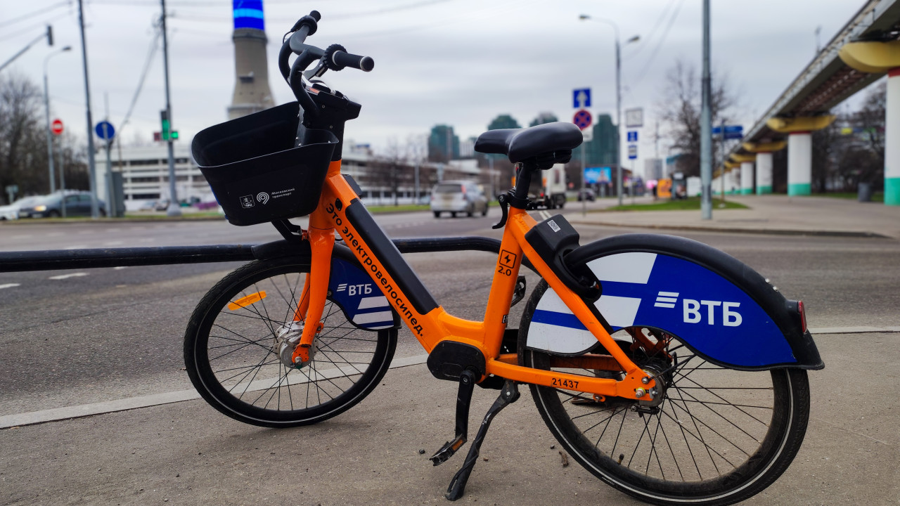 В кадре — электровелосипед с маркировкой городского проката, установленный на тротуаре рядом с дорогой. На заднем плане видны машины, уличные указатели и часть высотной башни, схожей по пропорциям с Останкинской телебашней. Велосипед оборудован корзиной и фирменной символикой, что отражает формат краткосрочной аренды. Сюжет иллюстрирует тему развития городской мобильности и доступного транспорта в мегаполисе.