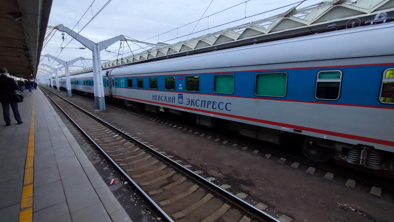 На фотографии изображён фирменный пассажирский поезд «Невский экспресс», стоящий у платформы на железнодорожной станции. Вагоны окрашены в светло-голубые и серебристые тона с надписью «Невский экспресс» и логотипом РЖД. По всей длине пути тянутся контактные опоры и крытая часть перрона. В левой части кадра видны пассажиры, готовящиеся к посадке. Маршрут поезда традиционно связывает Москву и Санкт-Петербург и относится к скоростным составам повышенной комфортности. Фотография подходит для тем о железнодорожном сообщении, инфраструктуре вокзалов и межгородских перевозках.