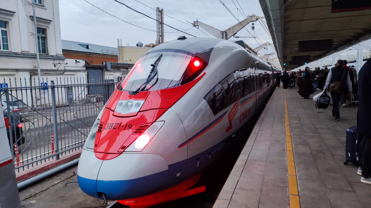 Снимок показывает высокоскоростной поезд «Сапсан», стоящий у пассажирской платформы. Вдоль состава видны ожидающие пассажиры с багажом, а также часть вокзальной инфраструктуры с навесами и контактной сетью. «Сапсан» эксплуатируется на российских железных дорогах с 2009 года и связывает крупные города, включая Москву и Санкт-Петербург, являясь одним из примеров модернизации пассажирских перевозок. Фотография может быть использована в материалах о транспорте, железнодорожной отрасли и инфраструктурных проектах.