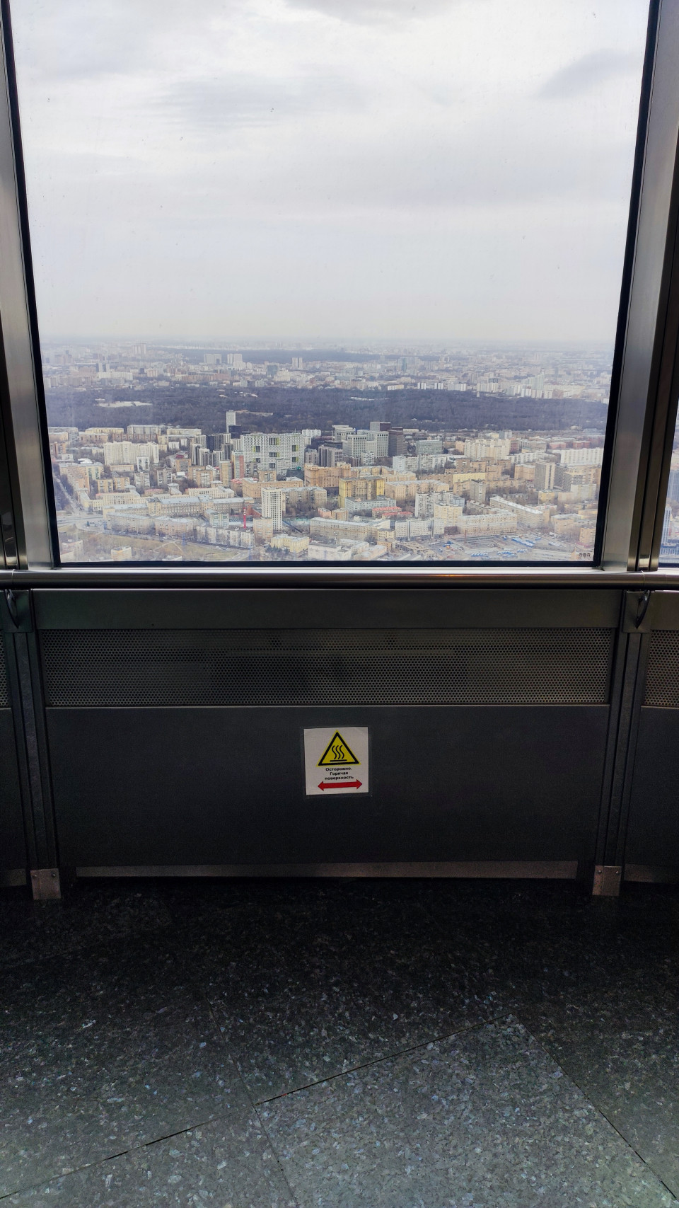 Фотография демонстрирует панораму Москвы, снятую через стеклянное ограждение смотровой площадки Останкинской телебашни, символа отечественной телерадиотрансляции и выдающегося примера инженерной архитектуры 1960-х годов. Сооружение введено в эксплуатацию в 1967 году и долгое время было самым высоким объектом в мире. В кадре видны жилые кварталы, зелёные массивы и протяжённая линия горизонта. Фотография может использоваться в материалах о городской среде, высотных смотровых точках и культурной инфраструктуре.