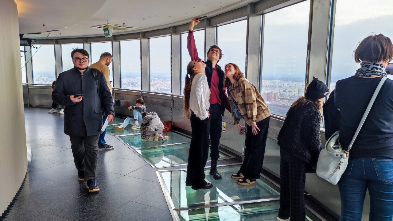 На фото изображены посетители смотровой площадки Останкинской телебашни в Москве, где установлены участки прозрачного пола с видом на город под стеклом. Часть людей фотографируется, другие наблюдают панораму через окна. Останкинская телебашня, построенная в 1967 году, является важным объектом отечественной инженерной архитектуры и главным центром телерадиовещания страны. Снимок отражает туристический аспект посещения высотных сооружений и интерес к панорамным видам.