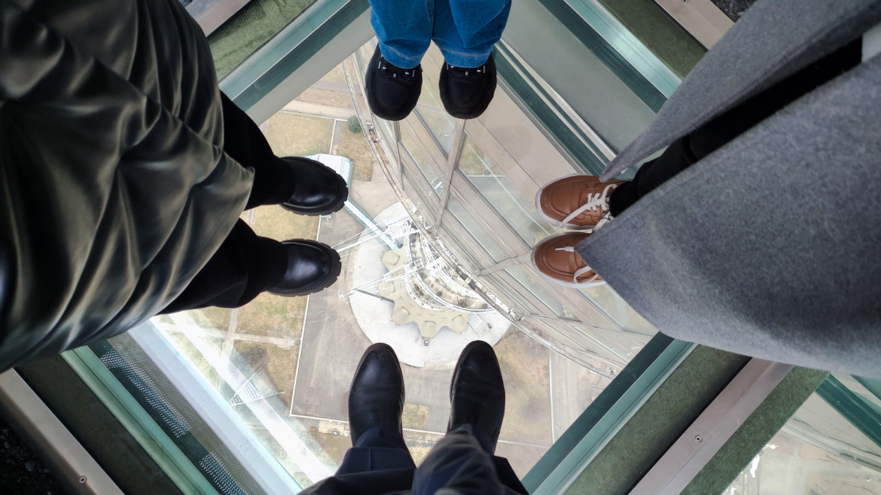 На изображении показана часть обзорной площадки Останкинской телебашни с прозрачным стеклянным полом, позволяющим посетителям видеть основание сооружения с высоты. Останкинская башня построена в 1967 году и является знаковым объектом советской инженерной школы и главным телерадиовещательным центром столицы. В кадре видны ноги нескольких посетителей, стоящих на стекле. Снимок может использоваться в материалах о туристических маршрутах, высотных смотровых площадках и архитектуре инженерных сооружений.