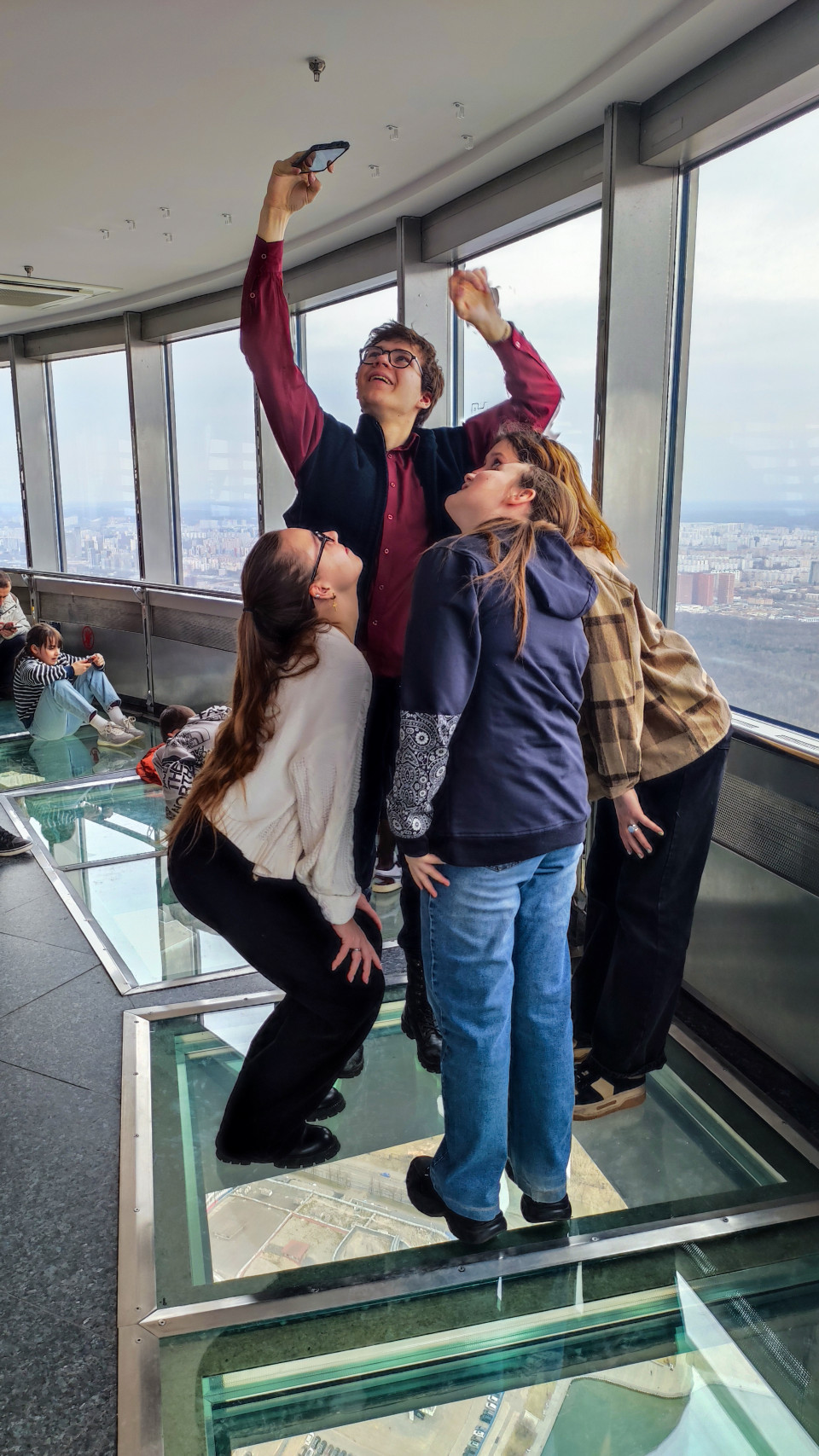 Фотография показывает несколько человек, стоящих на прозрачном участке пола внутри смотровой площадки Останкинской телебашни и фотографирующихся на фоне панорамного вида. Вдоль стен установлены широкие окна, через которые открывается обзор на московскую застройку. Останкинская башня — построенная в 1960-е годы телекоммуникационная вышка, являющаяся одной из высочайших смотровых площадок в России. Снимок отражает туристическую атмосферу и особенности интерьера высотной обзорной зоны.