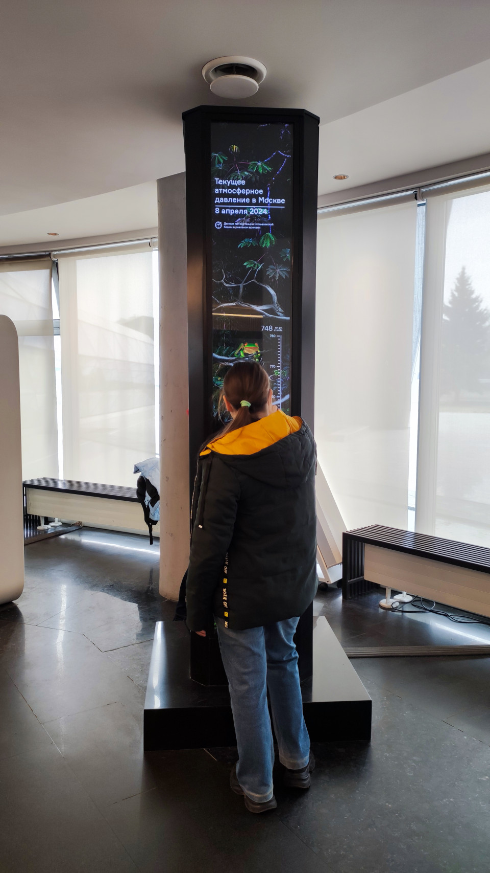 На фото изображён цифровой вертикальный экран с данными о текущем атмосферном давлении и дате, размещённый в интерьере смотровой площадки Останкинской телебашни. Возле стенда стоит посетитель, рассматривающий информацию. Конструктивные детали помещения, панорамные окна и оборудование указывают на высотное расположение объекта. Снимок иллюстрирует туристическую инфраструктуру и применение современных информационных сервисов в культурно значимых зданиях.