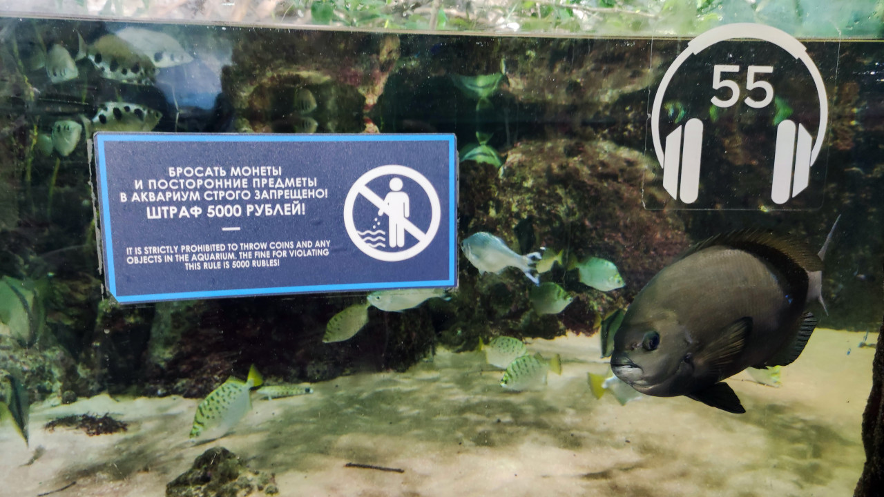Рыбная экспозиция и предупреждающая табличка в Москвариуме