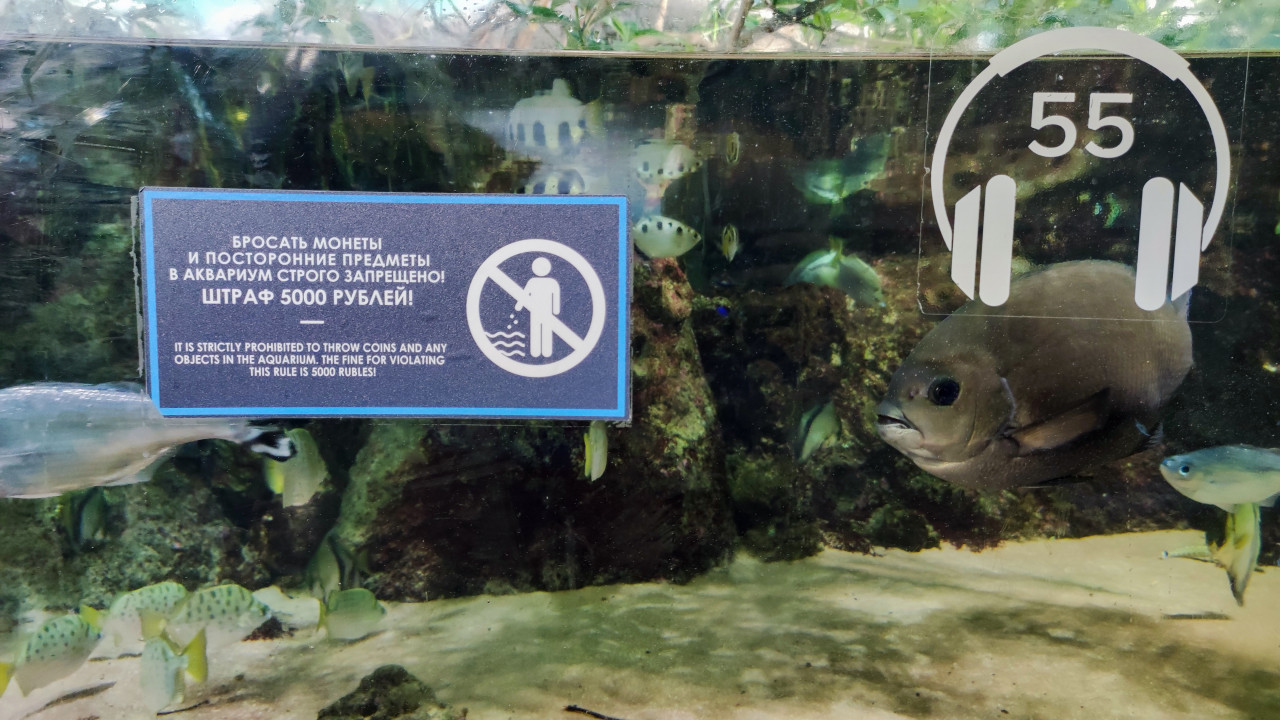На фото показан фрагмент аквариума в «Москвариуме» на территории ВДНХ, где на стекле размещена двуязычная табличка с запретом бросать монеты и посторонние предметы, сопровождаемая пиктограммой. Справа видна крупная рыба, на стекле рядом обозначен символ наушников с номером, указывающий на аудиогид. В аквариуме плавают различные виды рыб, среди которых встречаются полосатые и серебристые экземпляры. «Москвариум» является частью исторического выставочного комплекса ВДНХ, открытого в 1939 году, что придаёт объекту культурную и просветительскую значимость. Снимок подходит для информационных и образовательных материалов по теме правил посещения и охраны водных экосистем.