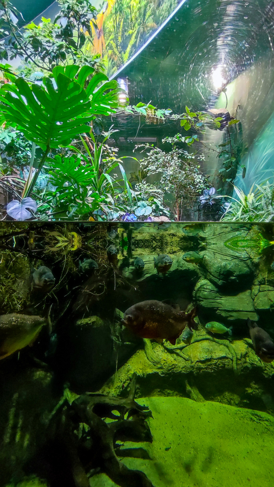 На снимке представлен биотопный аквариум с густой растительностью над поверхностью воды и различными видами рыб под водой, снятый в экспозиции Москвариума на ВДНХ, крупнейшего океанариума России. Декорация сочетает элементы тропической растительности и подводного ландшафта, создавая демонстрационную среду для наблюдения за поведенческими особенностями обитателей. Фото может быть использовано в материалах об экологии, природных биоценозах и музейных экспозициях.