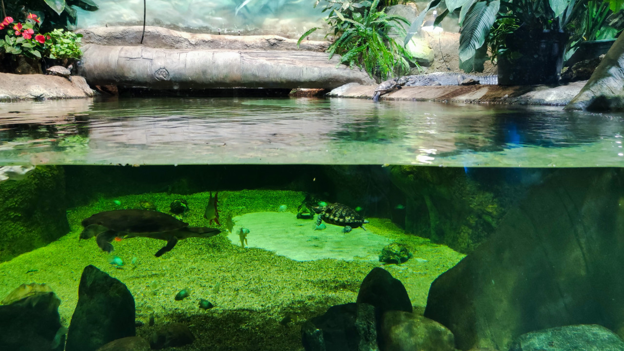 Аквариум с пресноводными видами и рептилиями в экспозиции