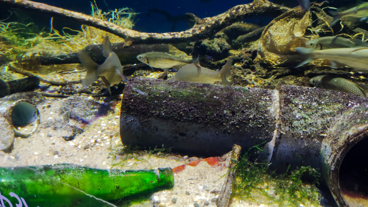 На фото представлен аквариум в Москвариуме на территории ВДНХ — крупнейшего океанариума России, открытого в 2015 году. Внутри композиции видны пресноводные рыбы и искусственные элементы среды — труба, стеклянная бутылка и фрагменты коряг, демонстрирующие проблему загрязнения водоёмов и последствий человеческой деятельности. Москвариум используется не только как выставочное пространство, но и как образовательная площадка по теме экологии и защиты водных экосистем. Кадр подходит для материалов об охране природы и просветительских проектах.