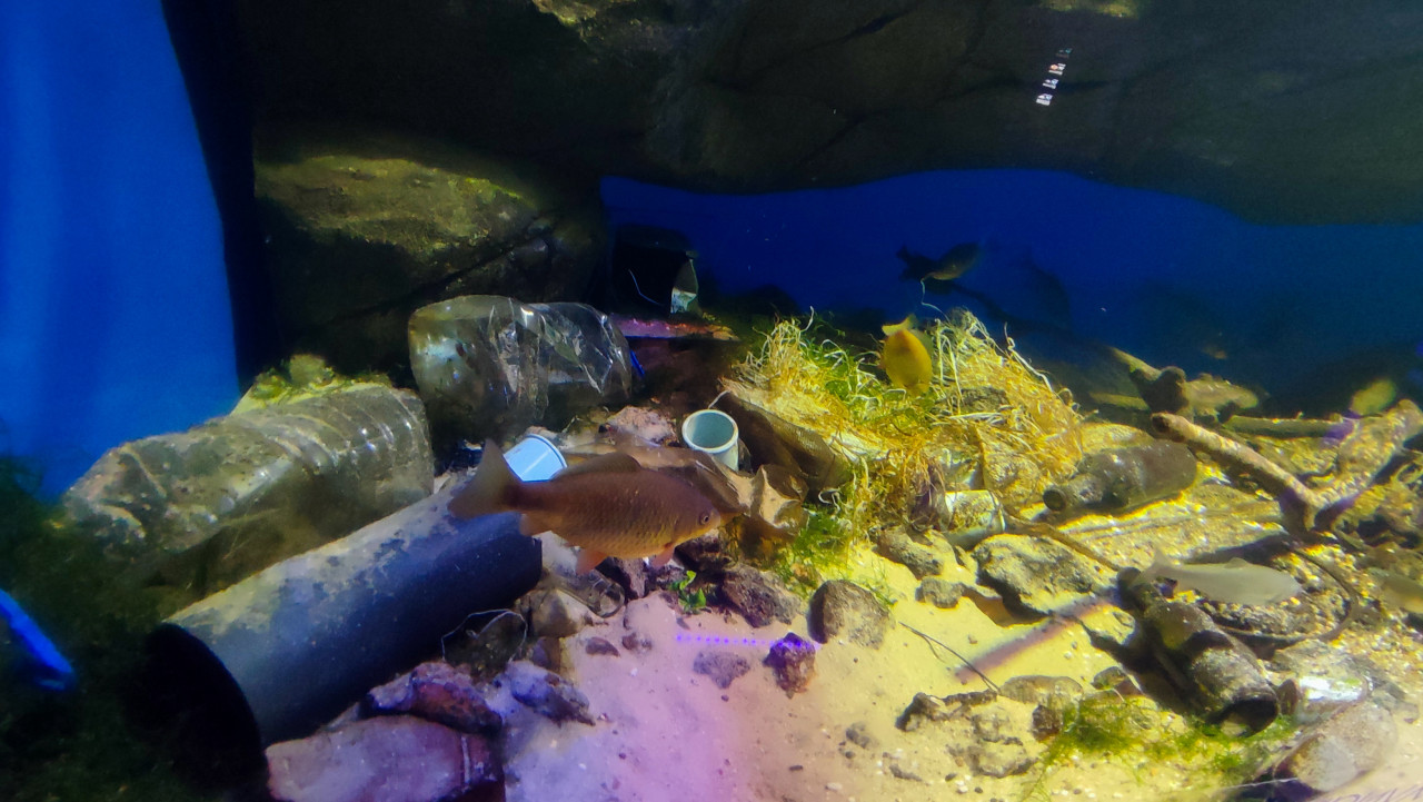 На фотографии представлена аквариумная зона Москвариума на территории ВДНХ, в которой демонстрируется модель загрязнённого водоёма. На дне видны пластиковые бутылки, пакеты, трубы и части мусора, размещённые рядом с живыми пресноводными рыбами. Такая экспозиция используется как часть экологического просветительского раздела океанариума, открытого в 2015 году, и иллюстрирует влияние отходов на водные экосистемы. Снимок можно применять в материалах о защите природы, загрязнении водоёмов и образовательных проектах.