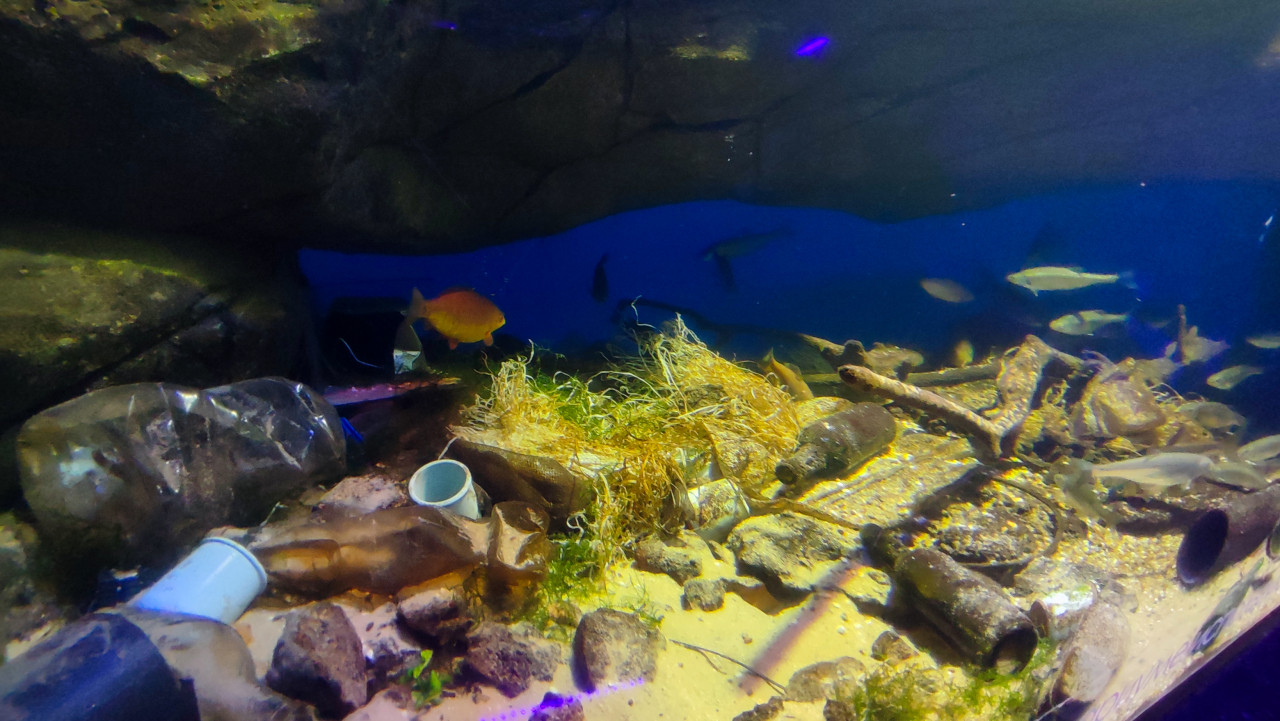 На снимке изображён аквариум в Москвариуме на территории ВДНХ, в котором демонстрируется модель загрязнённого водоёма: пластиковые бутылки, пакеты, трубы и сетки помещены на дно наряду с живыми рыбами. Такая экспозиция используется как часть образовательной программы об экологических угрозах и последствиях антропогенного воздействия на природу. Москвариум открыт в 2015 году и является крупнейшим океанариумом страны. Кадр подходит для тематики охраны окружающей среды и школьных экологических проектов.