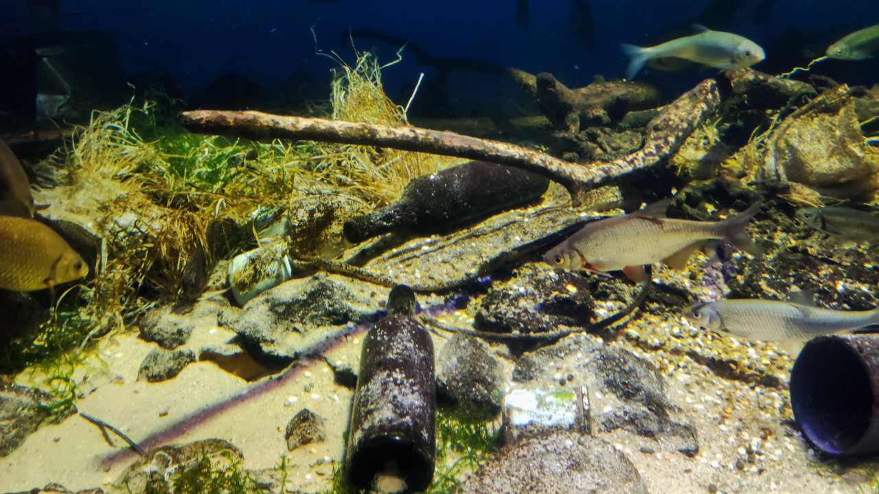 На фотографии показан аквариум с пресноводными рыбами, плавающими среди донных декораций, включая коряги, камни, остатки старых бутылок и элементы, имитирующие загрязнённую среду. Подобный дизайн экспозиции используется для демонстрации темы влияния человека на водоёмные экосистемы и восстановления природных равновесий. В кадре виден песчаный грунт с мелкими организмами и водорослями. Фотография может применяться в материалах об экологии, аквариумистике и музейных выставках, посвященных охране пресноводных экосистем.