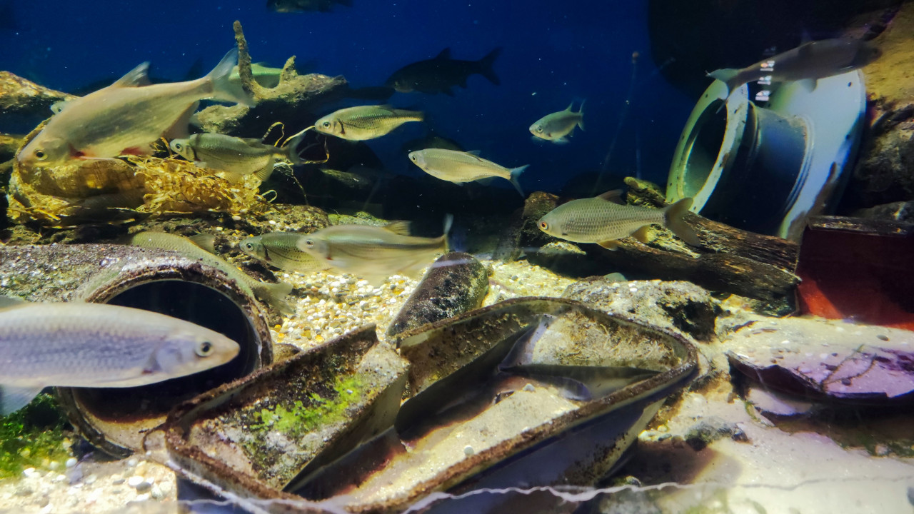На фотографии изображён пресноводный аквариум с рыбами, плавающими среди камней, песочного дна и декоративных объектов, имитирующих элементы затонувших конструкций. Экспозиция относится к разделу пресноводных биотопов Москвариума на ВДНХ и демонстрирует среду обитания водных видов в реках и озёрах. В кадре различимы водоросли и фрагменты декора, подчёркивающие экологический и образовательный характер демонстрационной зоны. Изображение можно использовать в материалах о биологии, аквариумистике и музейной подаче природных систем.