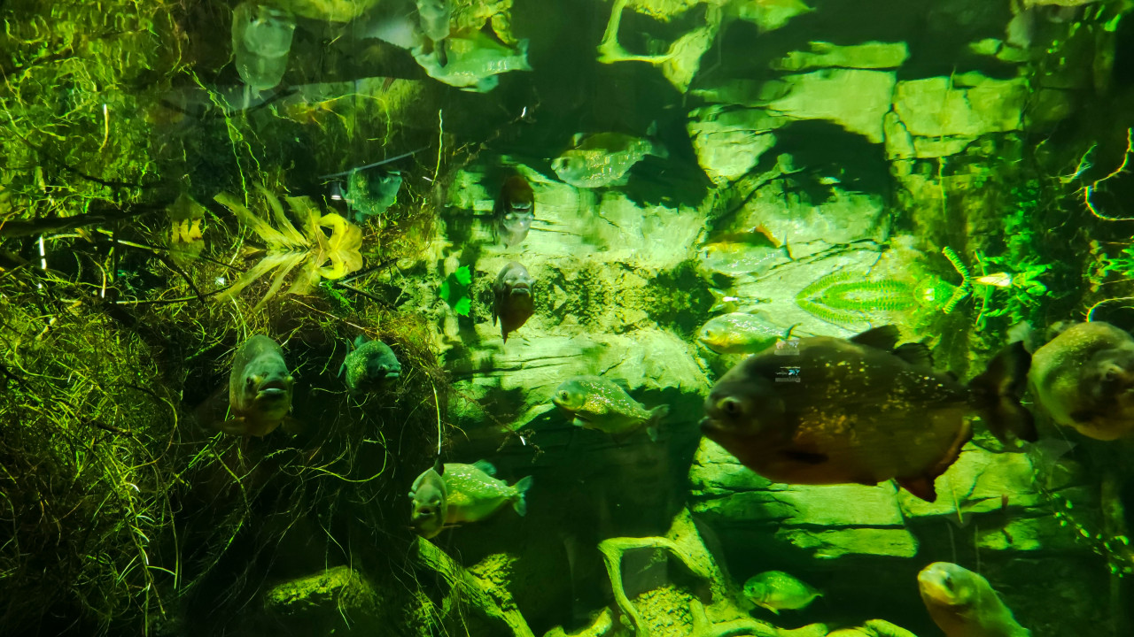 На изображении представлена экспозиция аквариума с пресноводными рыбами в зелёной световой гамме, создающей эффект подводной растительности. Съёмка осуществлена в Москвариуме на ВДНХ, который является научно-просветительским комплексом. В кадре видны каменистые формы, водные растения и рыбные стаи, размещённые на фоне имитации природного рельефа. Экспозиция показывает условия существования речных видов и используется для образовательных демонстраций. Фотография подходит для материалов по биологии, музейным экспозициям и тематическим публикациям о подводных экосистемах.