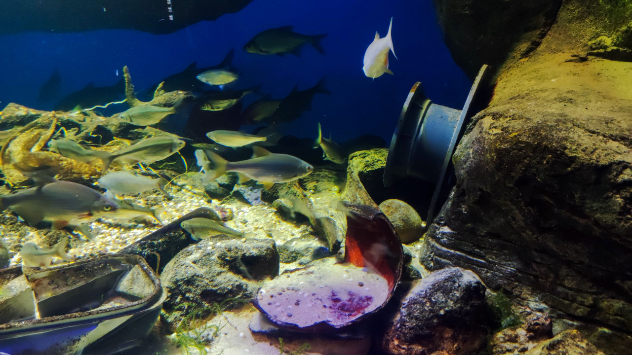 Стая пресноводных рыб в музейной экспозиции Москвариума