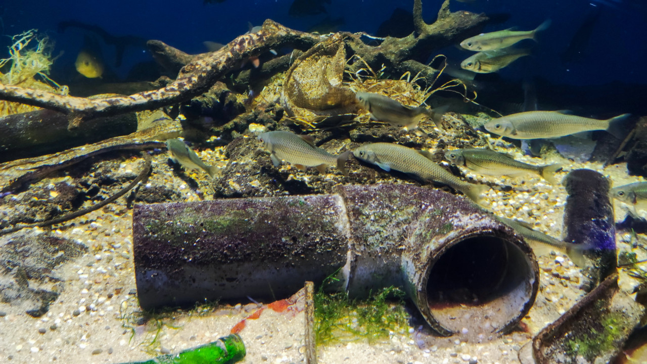 Кадр снят в экспозиции океанариума «Москвариум» на ВДНХ в Москве, открытого в 2015 году и считающегося одним из крупнейших в Европе. На фото изображён подводный участок с песчаным дном, крупной металлической трубой, покрытой обрастаниями, и группой пресноводных рыб, визуально относящихся к семейству карповых. В окружении заметны коряги и декорации, имитирующие изменение среды под влиянием человека. Снимок подходит для экопросветительских материалов, тем о сохранении водных экосистем и иллюстрации аквариумных биотопов.