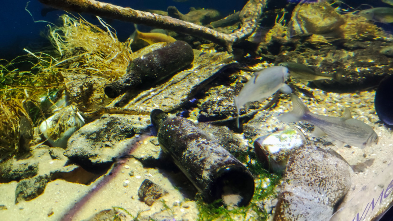 Сцена снята в «Москвариуме» на территории ВДНХ, одном из крупнейших океанариумов России, выполняющем образовательную и природоохранную функцию. На фото показано песчаное дно с крупной стеклянной бутылкой и другими предметами, имитирующими донный мусор, окружёнными водорослями, корягами и пресноводными рыбами. Такая композиция используется в экспозициях для визуализации последствий загрязнения и повышения внимания к охране водных экосистем. Подходит для статей и материалов на экологическую тему.