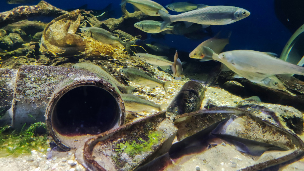 Фото снято в океанариуме «Москвариум» на территории ВДНХ в Москве, открытом в 2015 году как крупный образовательный и выставочный объект. На изображении показан фрагмент пресноводной экспозиции с трубами и металлическими элементами, покрытыми налётом и обрастаниями, имитирующими следы человеческого воздействия на водную среду. Вокруг движутся стайные рыбы, визуально относящиеся к семейству карповых. Композиция акцентирует внимание на теме экологии и демонстрирует типовое оформление аквариумных биотопов для просветительских программ.