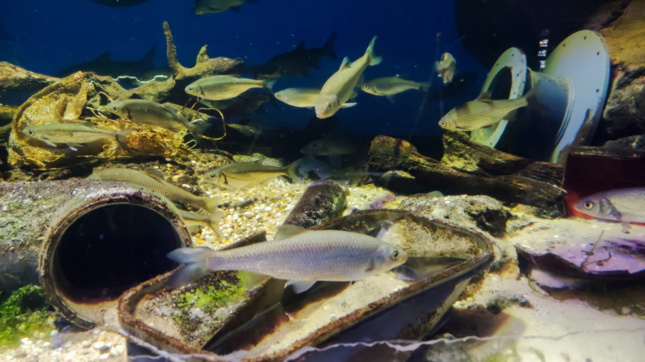 Снимок показывает группу пресноводных рыб в одном из залов Москвариума на ВДНХ, среди элементов, имитирующих природно-техногенный донный ландшафт. Наличие труб, коряг и укрытий создаёт обучающий контекст о том, как объекты техногенного происхождения становятся частью водных экосистем. Такие экспозиции используются для популяризации экологических знаний и визуальной демонстрации адаптации водных видов.