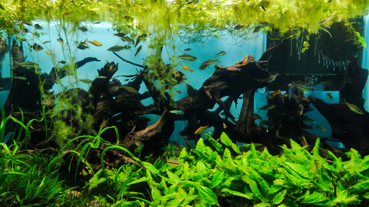 На фотографии виден крупный аквариум с густой водной растительностью, древесными корягами и многочисленными стайными рыбами. Композиция напоминает природный биотоп с разным уровнем растительности — от донных растений до плавающей зелени у поверхности. Подобные экспозиции используются в Москвариуме на ВДНХ как часть демонстрации пресноводных экосистем и природного поведения рыб. Снимок может быть применён в материалах о подводных биотопах, аквариумистике и демонстрационных экосистемах.