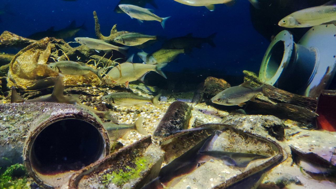 На фото представлен фрагмент аквариума с пресноводными рыбами, плавающими среди элементов техногенного происхождения: коряг, обломков труб и старых емкостей, имитирующих загрязнённое дно. Экспозиция характерна для экологического раздела Москвариума на ВДНХ, где иллюстрируются последствия человеческой деятельности на водные экосистемы. Освещение создаёт эффект естественной глубины и подчёркивает контраст между природными и искусственными объектами.