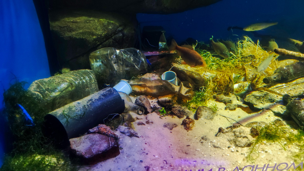 Аквариумная экспозиция с иллюстрацией загрязнения водоёмов