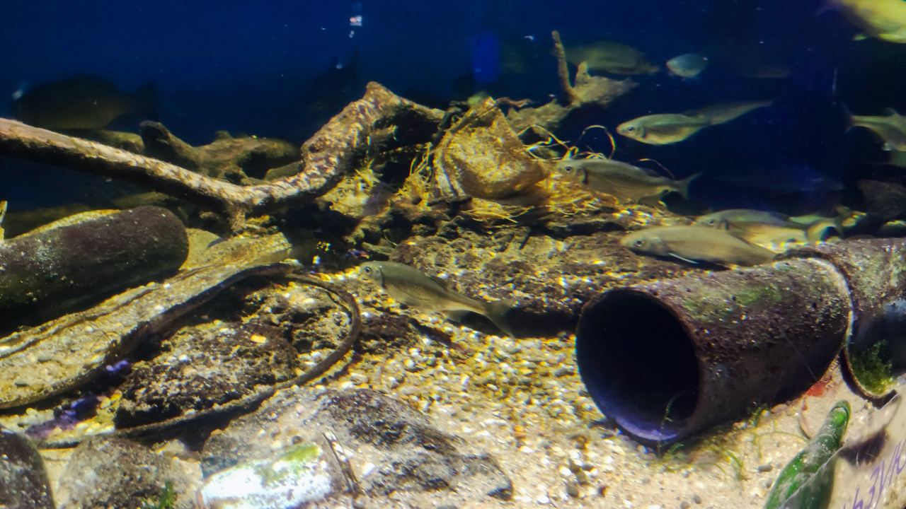 Рыбы среди пластиковых бутылок и мусора в пресноводной экспозиции