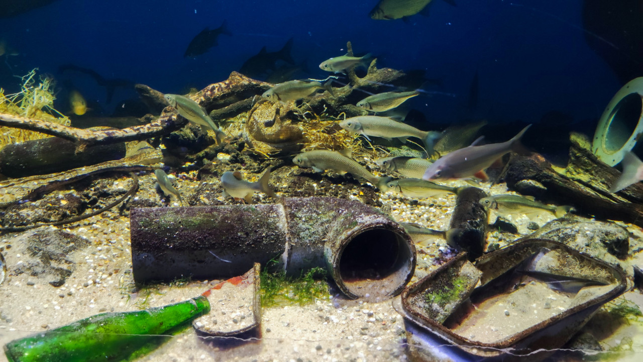 Снимок показывает аквариум Москвариума на ВДНХ с пресноводными рыбами, плавающими среди имитации загрязнённого дна — ржавых металлических предметов, обломков бутылок, коряг и мусора. Экспозиция визуализирует тему антропогенного влияния на водные экосистемы и служит образовательной иллюстрацией проблем окружающей среды. Подобные стенды используются для экопросвещения в музейных пространствах.