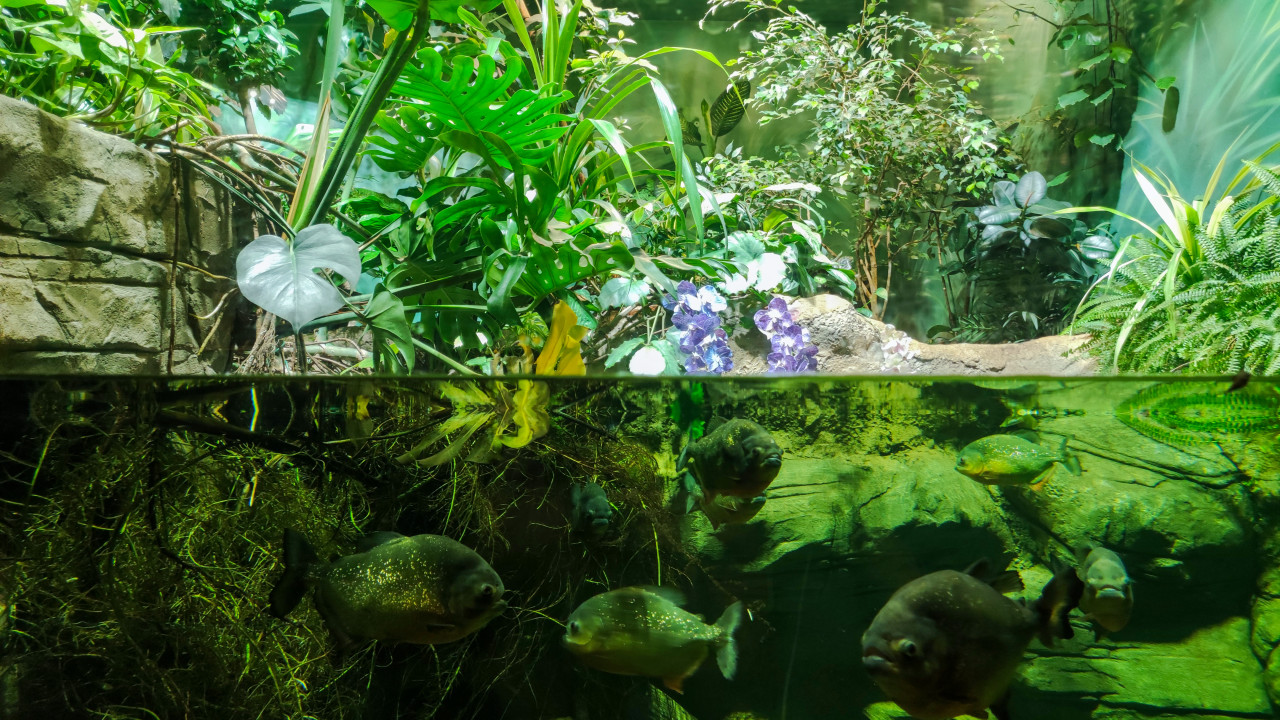 На фото показан аквариум из экспозиции Москвариума на ВДНХ, совмещающий подводную часть с рыбами и надводный ландшафт с тропическими растениями. В кадре видны зелёные лиственные растения, орхидеи, монстера и каменистая основа, имитирующая природное русло. В нижней части аквариума плавают рыбы, обитающие в пресной воде. Такая композиция демонстрирует принципы экодизайна, характерные для экспозиций Москвариума, открытого в 2015 году как один из крупнейших океанариумов Европы. Фото подходит для иллюстраций о флоре, фауне и музейных биотопах.