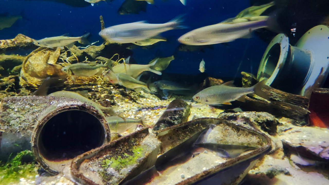 На снимке изображён аквариум из экспозиции Москвариума на ВДНХ, где представлены пресноводные рыбы среди камней, раковин и металлических предметов, имитирующих дно реки. Видны различные виды рыб, движущиеся среди песчаного грунта и коряг. Такое оформление используется для демонстрации экосистем с участием человека, где природная и техногенная среда взаимодействуют. Фото подходит для образовательных публикаций о водных биотопах, влиянии загрязнений и музейных экспозициях.
