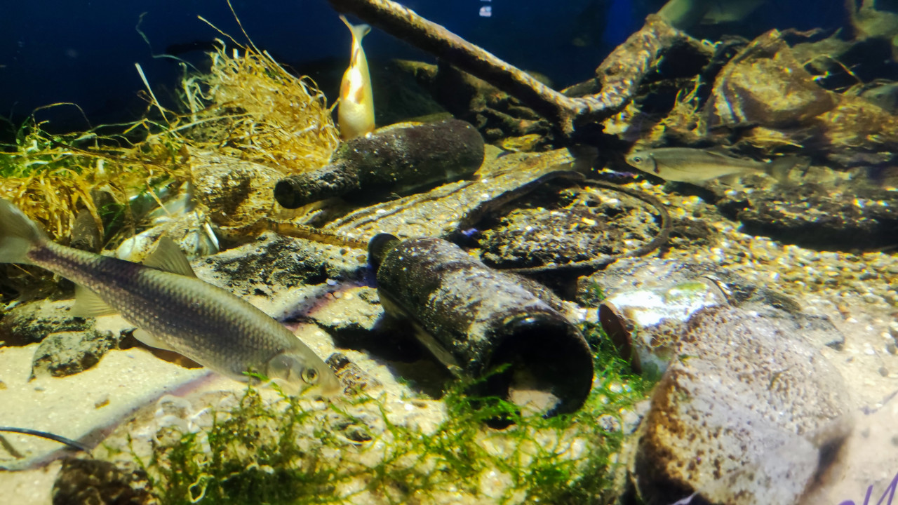 На снимке изображён аквариум из экспозиции Москвариума на ВДНХ, оформленный с использованием элементов, имитирующих донный мусор: стеклянные бутылки, фрагменты металла и коряги. Между ними проплывают пресноводные рыбы, что демонстрирует влияние антропогенного загрязнения на водные экосистемы. Экспозиция визуально отсылает к проблеме загрязнения рек и озёр бытовыми отходами и служит наглядным примером экопросвещения. Фотография может использоваться в образовательных материалах, связанных с экологией и сохранением водных ресурсов.
