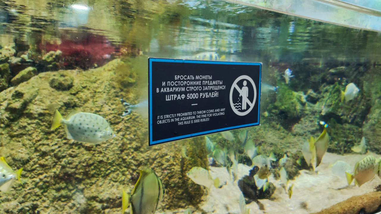 На снимке изображена табличка, размещённая на прозрачной стенке аквариума в Москвариуме на ВДНХ, информирующая о запрете бросать в резервуар монеты и посторонние предметы с указанием штрафа. На заднем плане видны морские рыбы и элементы декора, имитирующие природную среду. Двухъязычное оформление таблички подчёркивает туристическую направленность экспозиции. Изображение подходит для использования в материалах о правилах поведения в общественных учреждениях и экопросвещении.