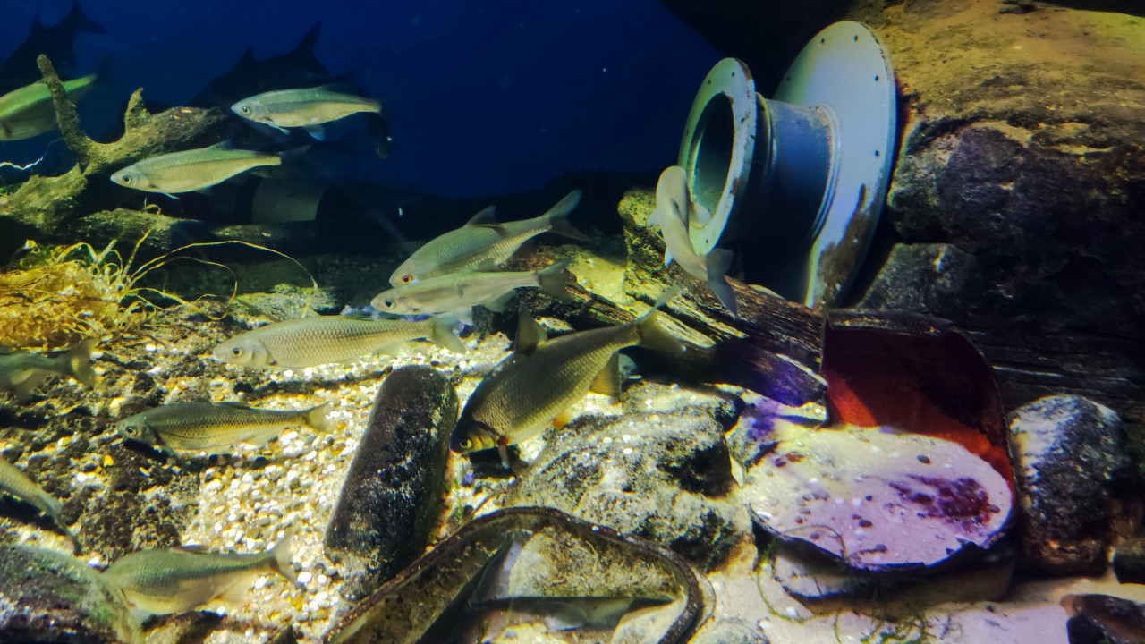 Аквариумная экспозиция с пресноводными рыбами и техногенными объектами