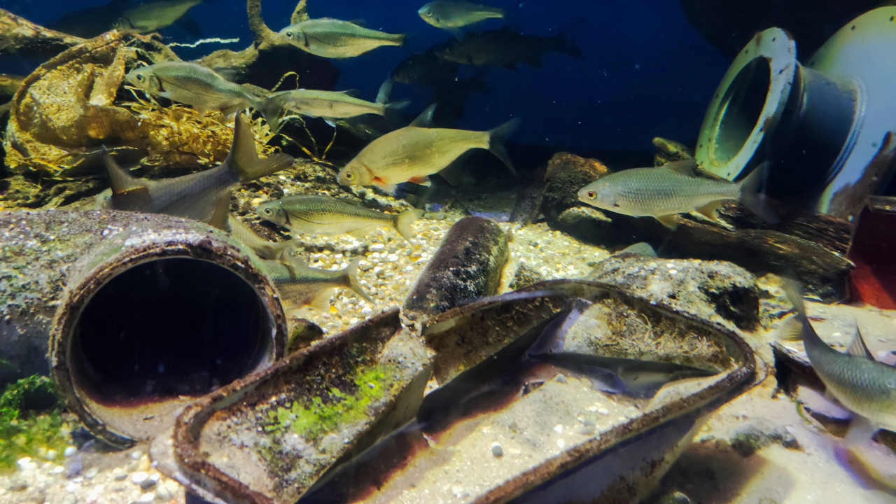 На изображении показан аквариумный биотоп с пресноводными рыбами и погружёнными декоративными элементами, имитирующими техногенные остатки на дне водоёма. Съёмка сделана в Москвариуме — крупнейшем океанариуме на территории ВДНХ, функционирующем как научно-познавательный центр. В кадре видны рыбы разных видов, гравийное дно, трубы и коряги, создающие естественно-средовой характер экспозиции. Снимок может использоваться в материалах об аквариумистике, экологии водных систем и музейно-выставочных пространствах.