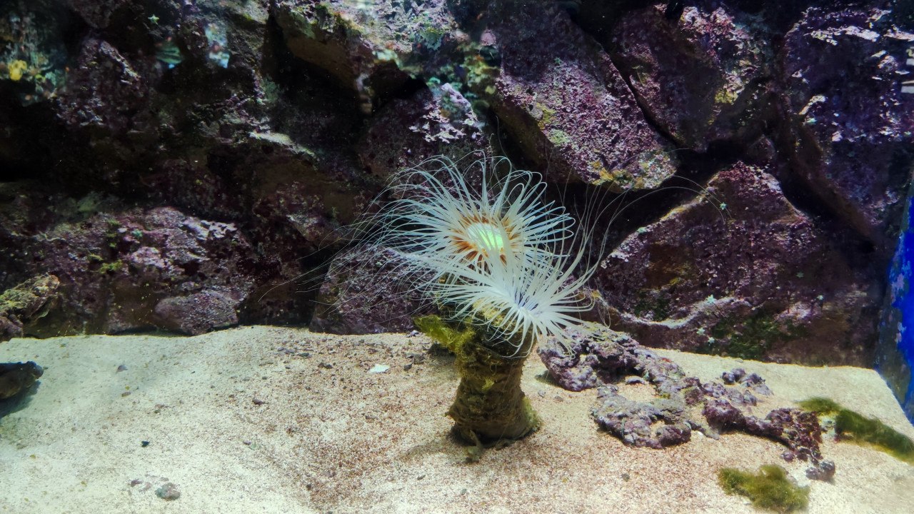 На фото запечатлена морская анемона, установленная на каменистом фрагменте донного рельефа в одном из залов Москвариума — крупнейшего океанариума России, расположенного на ВДНХ и функционирующего как научно-образовательная площадка. В кадре видны песчаное дно, скальная поверхность и открытые щупальца анемоны, ориентированные на фильтрационное питание. Экспозиция демонстрирует особенности поведения беспозвоночных в контролируемой морской среде. Снимок подходит для тематических материалов о морской биологии, музейных инсталляциях и средовых экспозициях в публичных океанариумах.