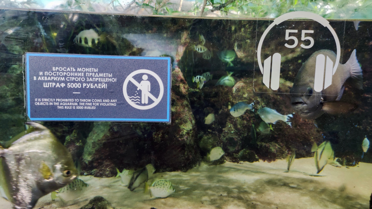 Аквариум с тропическими рыбами и предупреждающей табличкой в Москвариуме