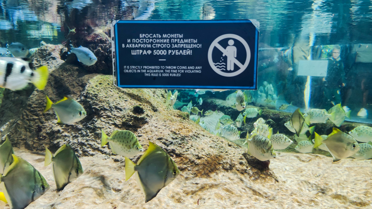 Аквариумная экспозиция с предупреждающим знаком в Москвариуме