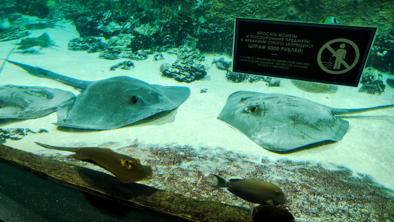 На снимке изображены несколько морских скатов, расположившихся на песчаном дне крупного резервуара в «Москвариуме» на ВДНХ. Рядом со стеклом закреплена табличка с предупреждением о запрете бросать монеты и посторонние предметы в воду, что связано с защитой животных от инородных объектов. В глубине видны дополнительные каменные элементы оформления, имитирующие природное морское дно. Экспозиция демонстрирует особенности поведения скатов и служит частью экологического просвещения посетителей. Снимок может использоваться в материалах о правилах посещения, безопасности и охране морской фауны.