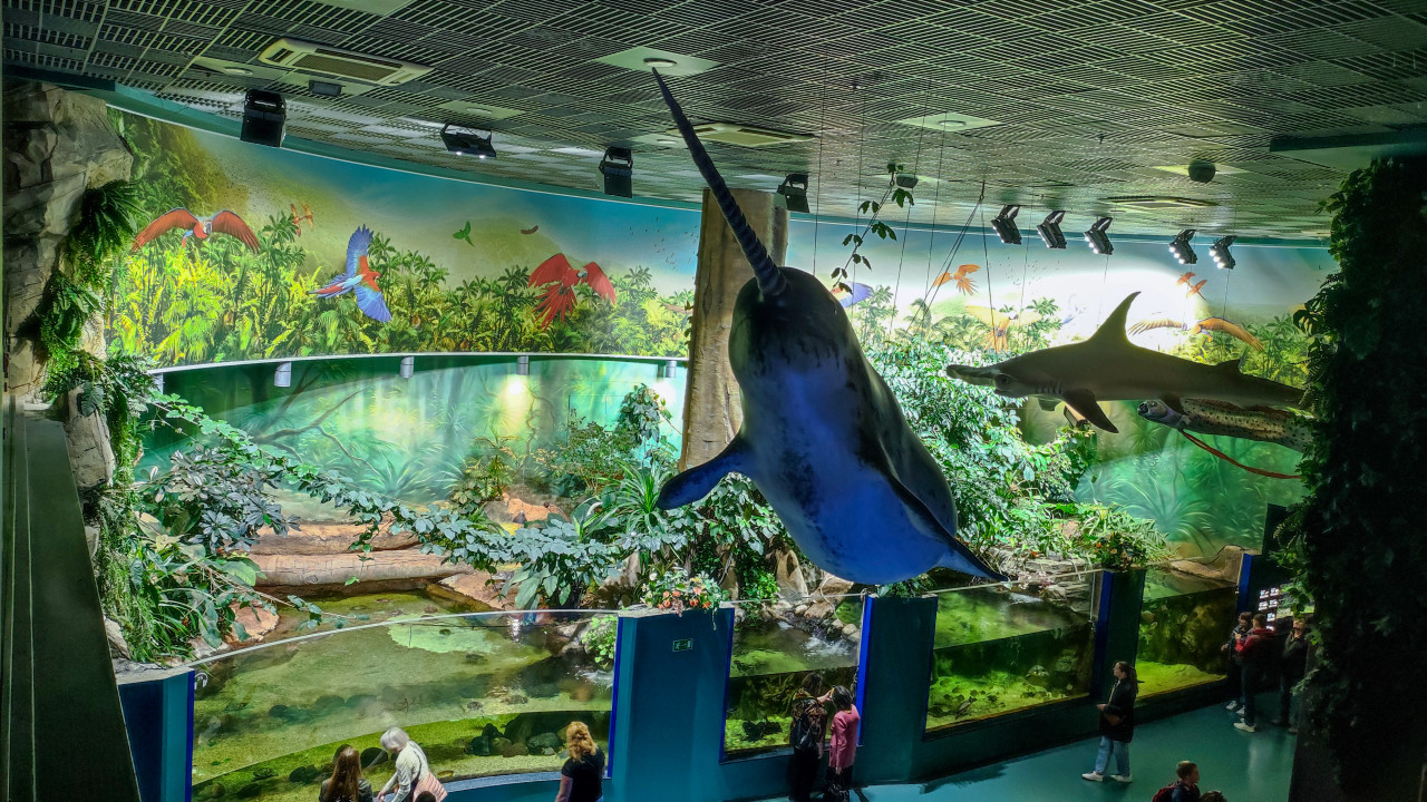 На фотографии показан верхний ярус выставочного пространства «Москвариума» на ВДНХ, где размещены крупные подвесные модели морских обитателей, включая нарвала и рыбу-меч. На стенах изображены тематические пейзажи тропического леса с экзотическими птицами, а внизу расположены аквариумы с живыми водными организмами. Композиция оформлена как образовательная зона, знакомящая посетителей с разнообразием водной фауны. Сцена может быть использована в материалах о музеях, выставочных пространствах и культурных объектах Москвы.