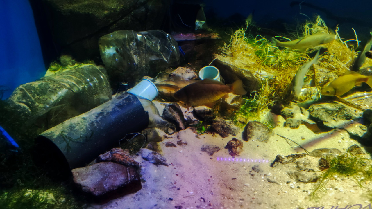 Рыбы среди пластиковых бутылок и мусора в пресноводной экспозиции