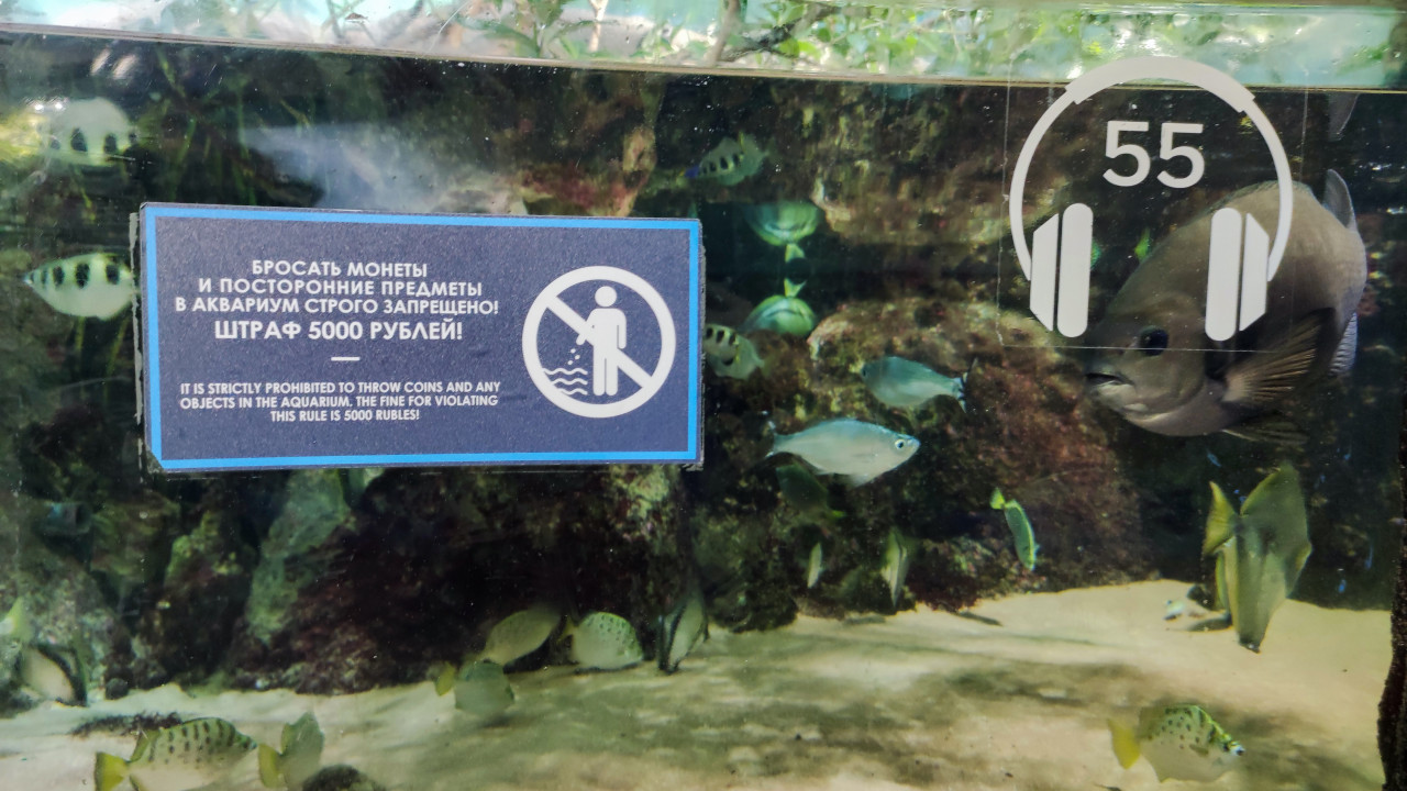 На фото изображена табличка о запрете бросать монеты и посторонние предметы в аквариум в «Москвариуме» на ВДНХ, рядом нанесён номер аудиогида «55». За стеклом наблюдаются рыбы и растительность в толще воды. Подобные обозначения используются для защиты животных и удобства посетителей, обеспечивая синхронизацию визуальной экспозиции с аудиосопровождением. Снимок подходит для тематики музейной навигации и правил поведения.
