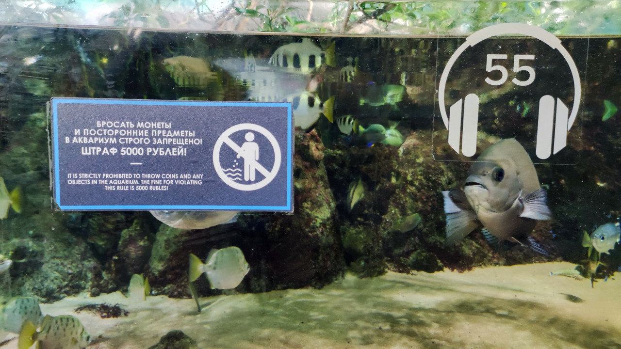Фотография сделана в «Москвариуме» на ВДНХ и показывает предупреждающую табличку о запрете на бросание монет и иных предметов в резервуар. Справа нанесён значок аудиогида, а в аквариуме за стеклом видны тропические рыбы и элементы оформления донной среды. Подобные указатели помогают сохранить водную систему и предотвратить вред для животных. Сцена может быть использована для тематики безопасности, музейных правил и сохранения среды обитания.