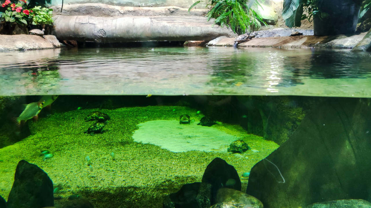 На снимке показана экспозиция «Москвариума» на ВДНХ, представляющая полузакрытый водоём с пресноводными животными. В верхней части кадра, на береговой зоне среди камней и растений, видна черепаха, поднявшаяся на сушу. Под водой заметна зелёная зона с грунтом и мелкими рыбами на дне. Инсталляция оформлена таким образом, чтобы продемонстрировать переходную среду между водой и береговой линией, характерную для болотистых и тропических экосистем. Фотография подходит для материалов о пресноводных видах и средах обитания.