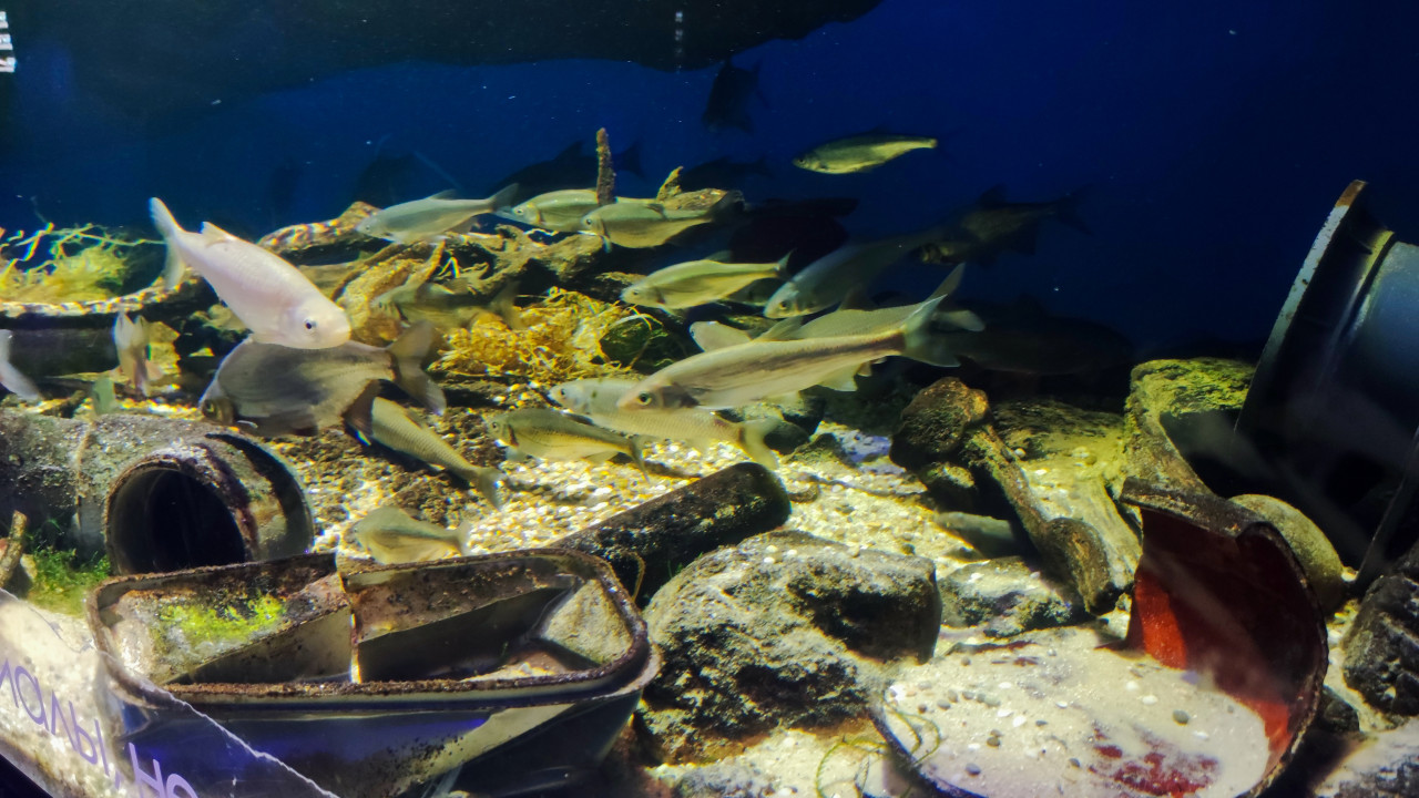 В кадре показан участок пресноводной экспозиции «Москвариума» на ВДНХ, где разместили имитацию металлических и пластиковых отходов, чтобы продемонстрировать воздействие бытового мусора на водные экосистемы. Рыбы разных размеров плавают среди проржавевших труб, коряг, песка и растительности, частично покрывающей предметы. Такая визуальная композиция используется для экологического просвещения и формирования ответственного отношения к природе. Фотография может применяться в образовательных и информационных материалах.