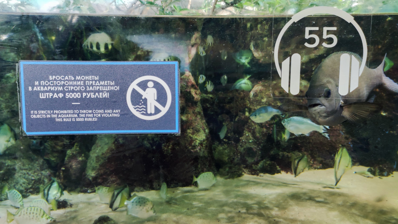 Аквариум Москвариума с предупреждающей табличкой